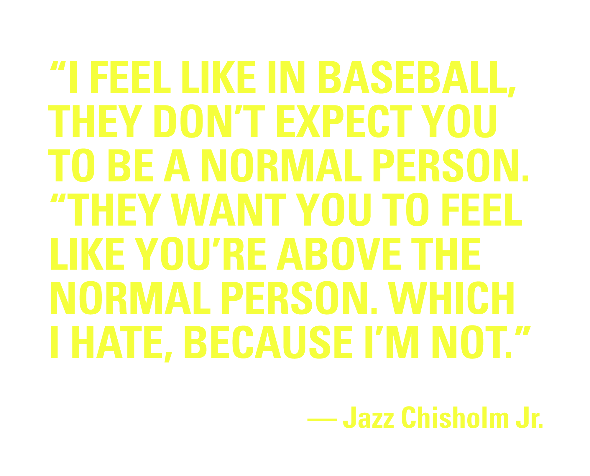 “I feel like in baseball, they don’t expect you to be a normal person,” Chisholm tells me in mid-January from The West Hollywood EDITION, tucked away in his California training cocoon. “They want you to feel like you’re above the normal person. Which I hate, because I’m not.”