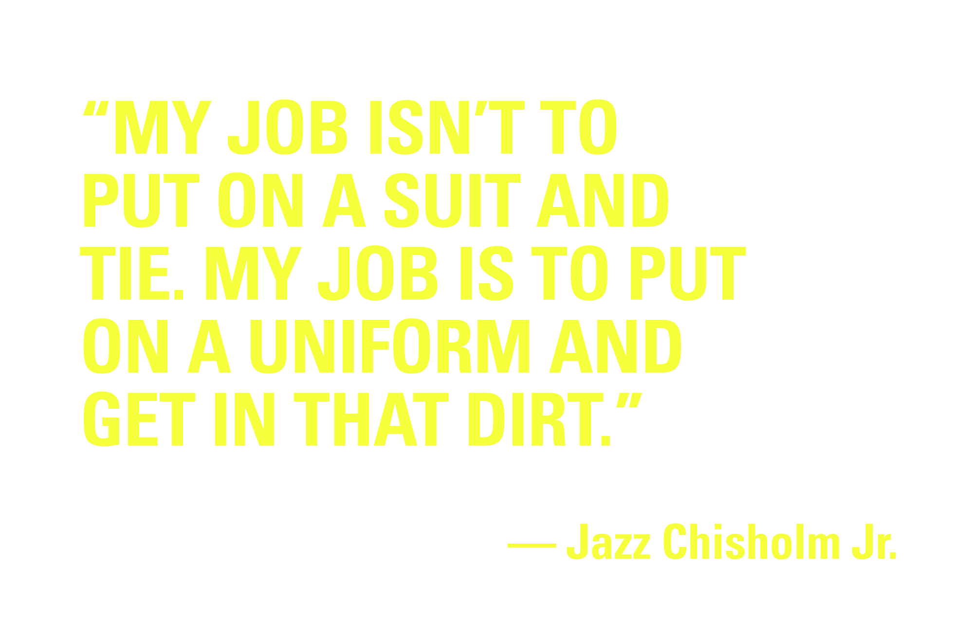 It was Chisholm’s grandmother, a professional softball player, who first introduced him to the concept of smacking a ball with a bat. She would take him out to the diamond every weekend and guide him through hitting and fielding drills. “She was like a superstar to everybody,” he says. “So I just wanted to be like Grandma.”