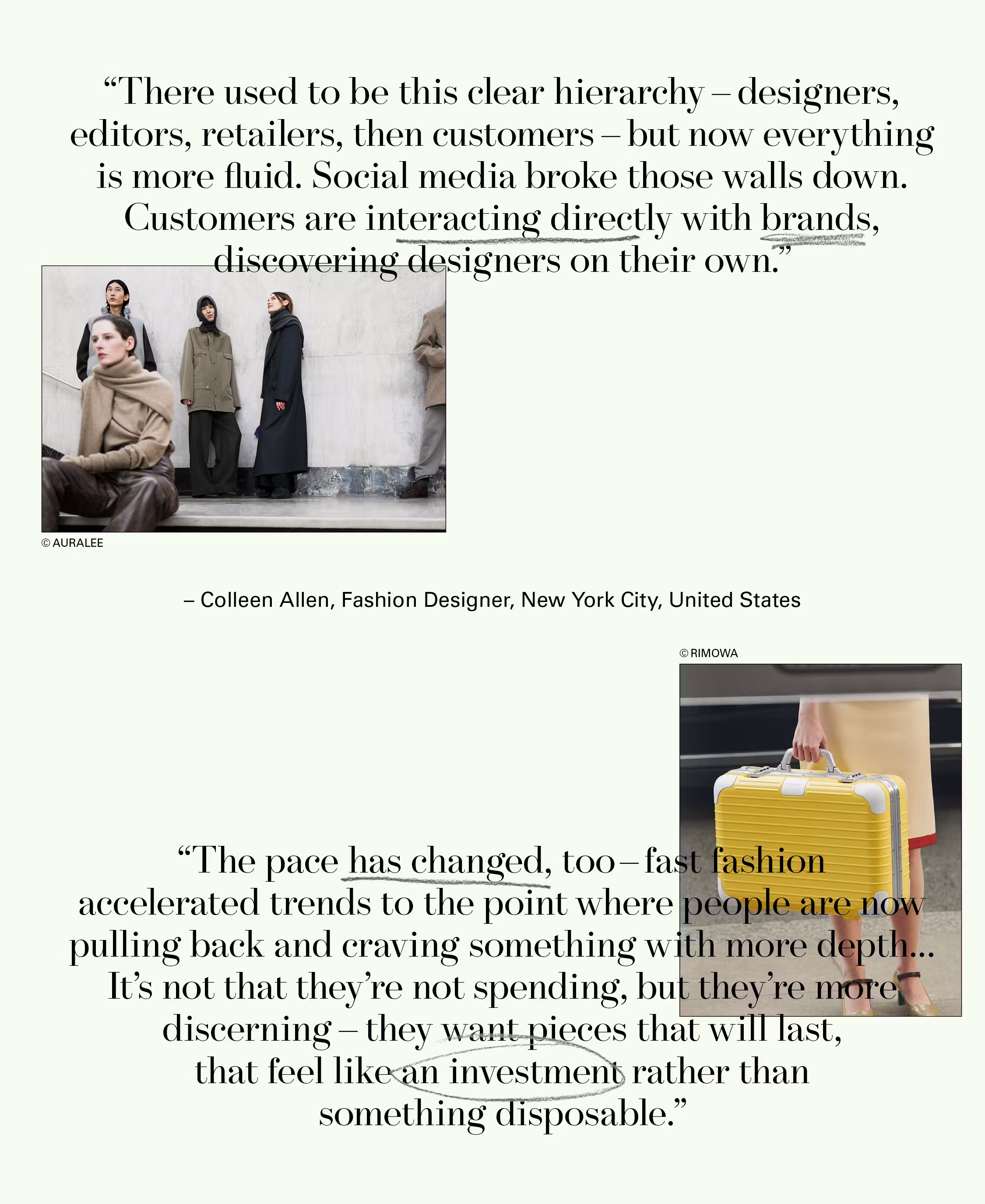 “Despite the ever-increasing push for commercialization, there are always bright spots of independence. Fashion is, at its core, a creative industry, and I believe originality and dynamic voices will continue to break through.” —Jesse Hudnutt, Fashion Consultant, New York City, USA