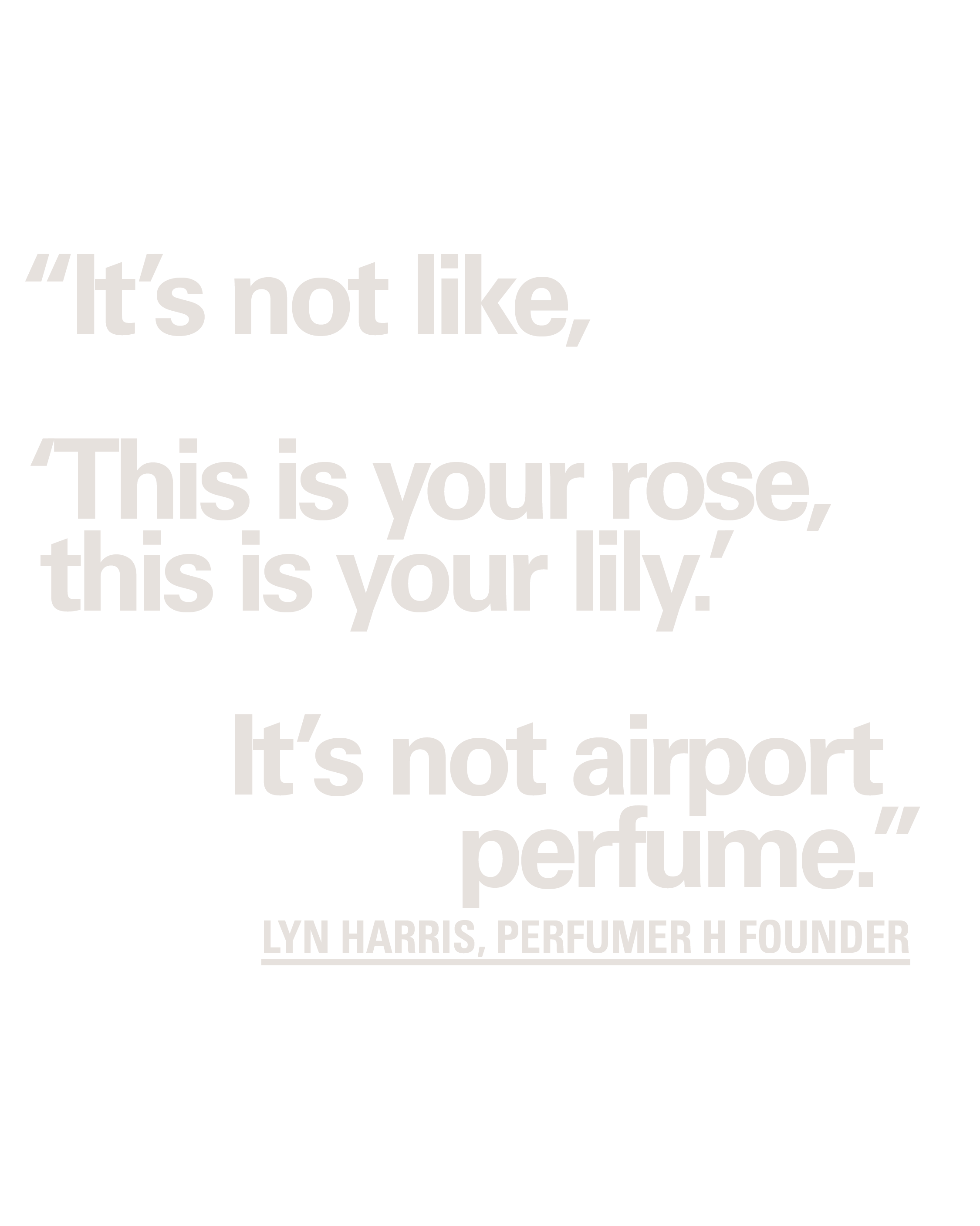 Harris was ahead of her time in becoming an independent perfumer. The internet has bred a guerilla generation — people who trained themselves rather than completing formal schooling. It’s a vastly different approach, but Harris isn’t against it. “The information you get online is quite phenomenal. I think if you’re very intelligent and have a natural affinity to materials, it’s kind of like being a cook; you can learn without going to school,” she says. “I was isolated because I never worked with a perfumer day to day. I had amazing experiences in Grasse and in Paris, but I was always totally by myself in my lab in England. But I’m a lot better off having that.” The downside is that she thinks it took her longer to develop her signature. The upside is that nothing else smells like Perfumer H.