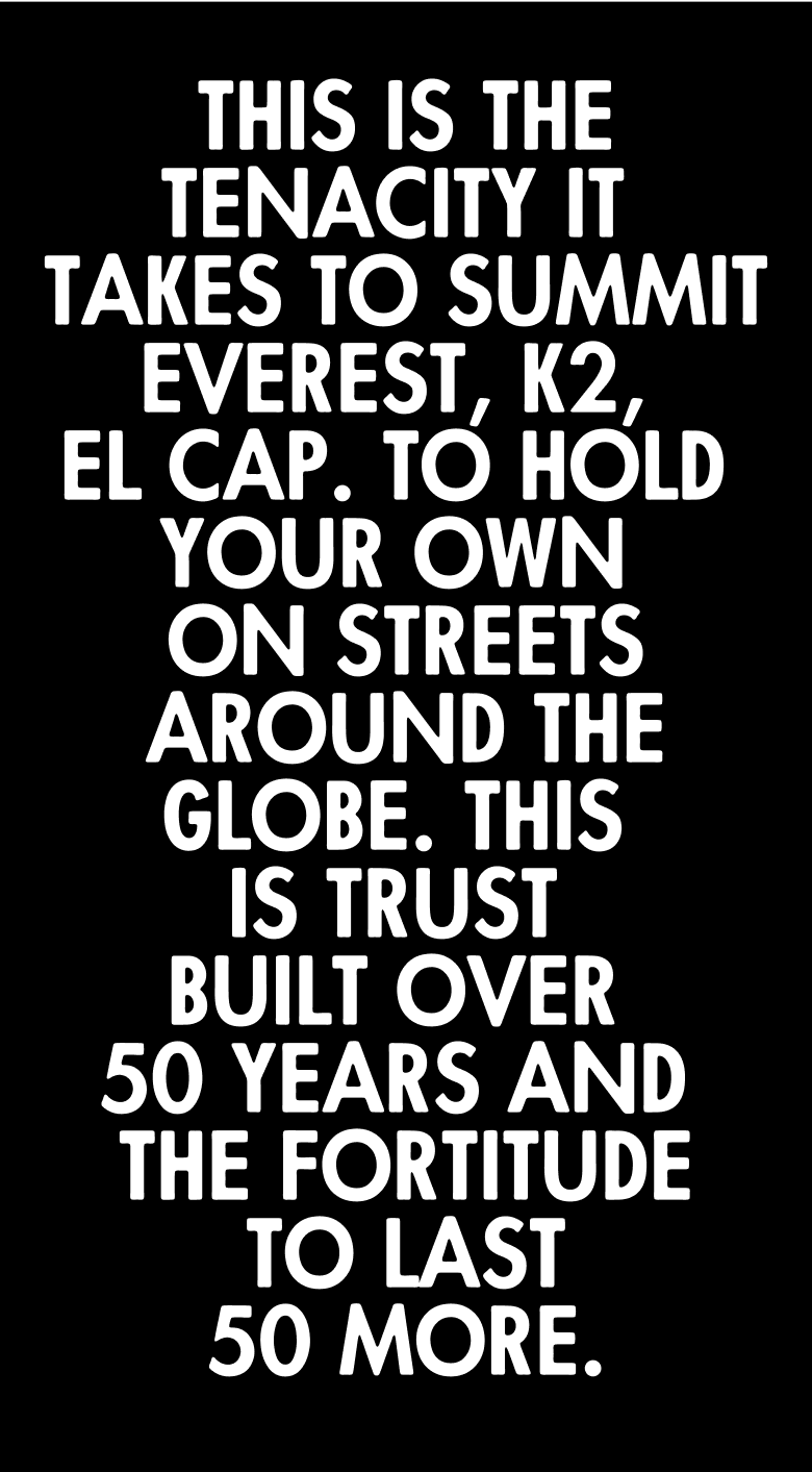 The Sierra Parka was my first connection with the brand. As an aspiring climber, having a The North Face Sierra Parka… and a JanSport frame pack was the look I was after. It was also quite functional. There is tree sap on the back, which is the worst fabric stain. There’s a reason old time boats were built with sap and pitch for water-fastness. [There’s also a] ramen/watery oatmeal spill patina up front. (Note: Conrad’s Sierra Parka has found a home on display at The North Face office.) [Since then, I’ve been enabled to pursue] a personal journey of self-discovery with friends in a location that is inspiring to one’s soul. I need wilderness and the shared experience of working towards a goal to survive our oversubscribed life.